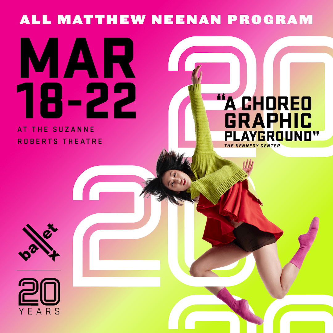 Matthew Neenan, co-founder of BalletX, is celebrated for his groundbreaking choreography, musicality, and creativity. In his 28th world premiere for the company, he joins forces with award-winning composer and musician Scott Ordway and designer Christopher Ash to explore how simple gestures gain strength in unity – a joyful reminder of what we can achieve together.